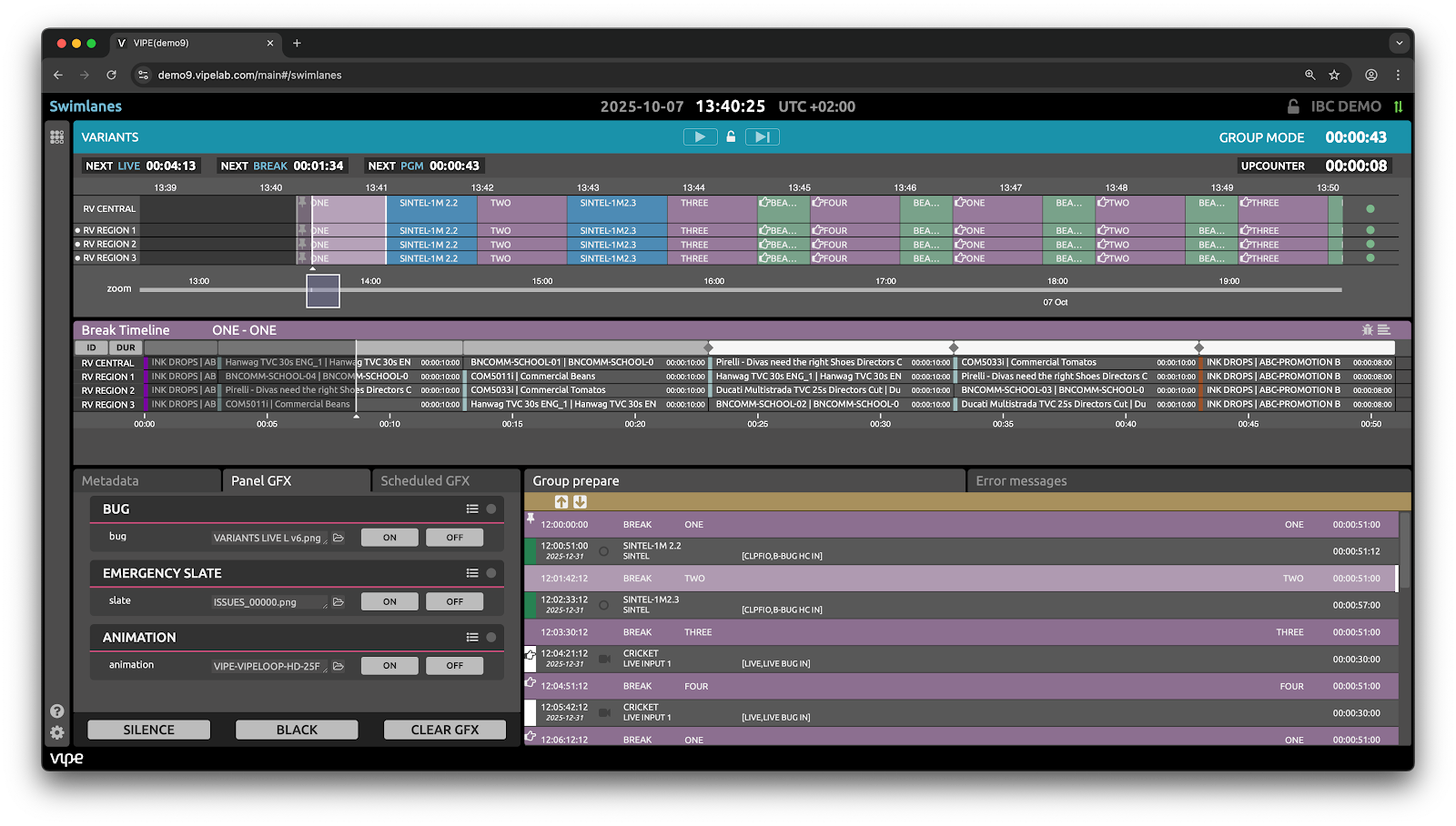 Using swim-lane and break-container UI, operators can manage breaks in live events across dozens of channels at a glance. Identifying timing issues becomes immediately apparent, even to a non-expert, allowing for preemptive correction. This design transforms multi-channel management of live events from a high-stress juggling act into a calm, predictable process.
